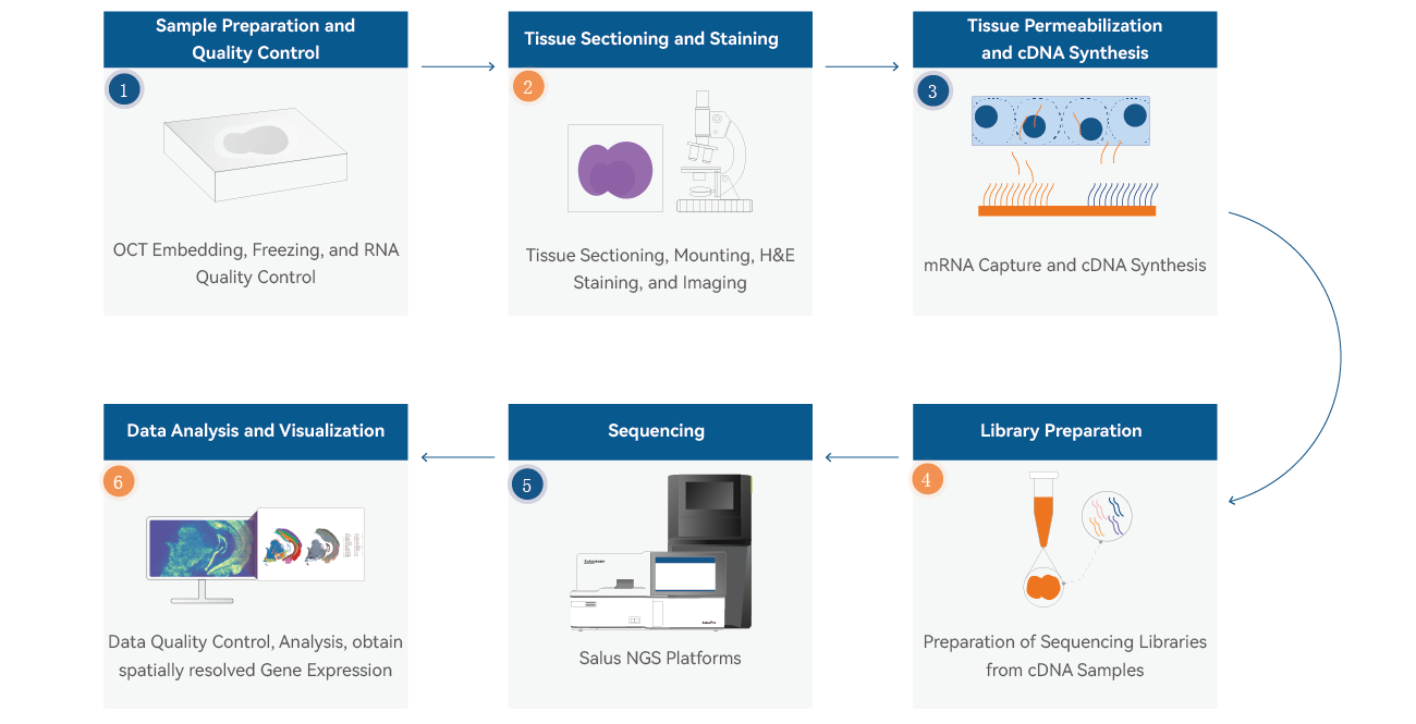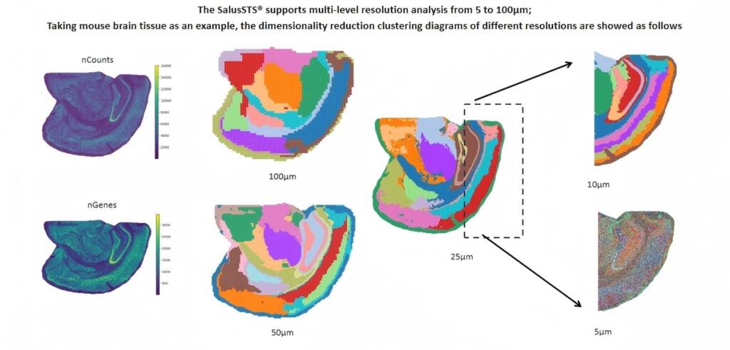 By leveraging Salus proprietary high-throughput sequencing and super-resolution fluorescence imaging technologies,SalusSTS®enables more effective research at a subcellular resolution analysis on tissue cell functions, intercellular microenvironment interactions, and disease pathology, etc.
