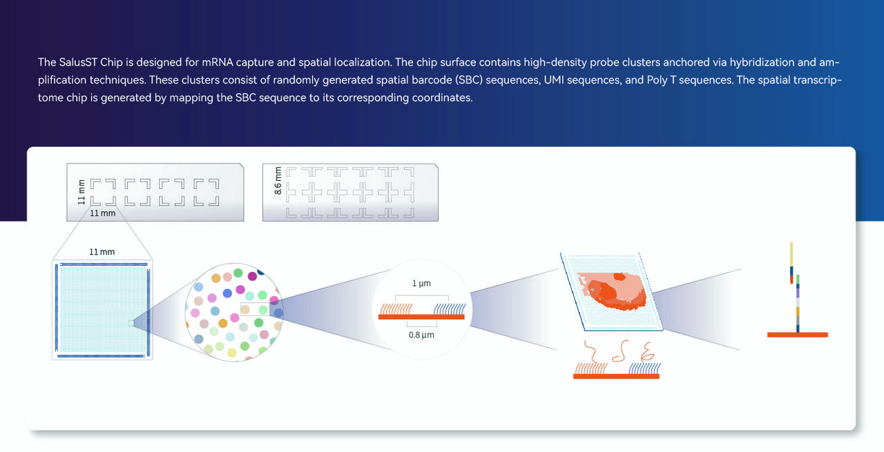 Explore Salus’ leading high-resolution spatial transcriptomics solutions(STS) .SalusSTS® is a powerful genomics research tool that contains ultra-high density chips, a gene sequencer, a tissue biochemistry workstation and a data analysis toolkit.